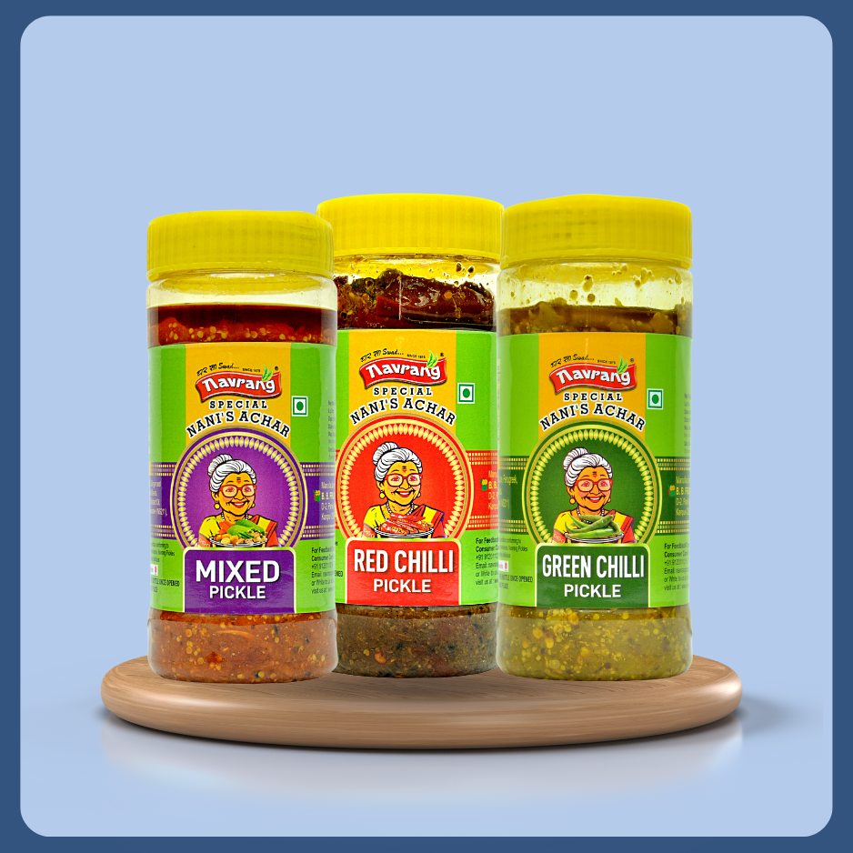 Navrang Achar is a celebration of authentic Indian flavors, crafted with love and tradition. Our pickles are made from the finest ingredients, ensuring that every jar is packed with the rich, vibrant taste that brings joy to your meals. Whether it's the tangy zing of our Mango Pickle or the fiery kick of Green Chilli, each product reflects our commitment to quality and taste.